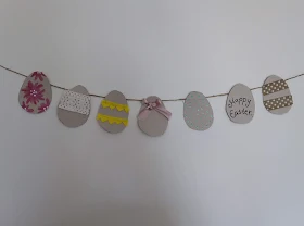 Toinen idea on suklaamunaketju, johon sain myös ilmaista materiaalia pakastepitsan laatikosta. Koristeet ovat kaikenlaisesta tilpehööristä tehty mitä vain kotoa löysin ja keksin. Ainoat ostetut tavarat ovat pinkki ja vihreä akryyliväri. Munat laitoin teipin paloilla juuttinaruun kiinni. Tähän tuli vähän enemmän värejä! Yritin laittaa jokaiseen munaan erilaisen koristelun, lempparini on tuo muna jossa on pinkkejä metallinhohtoisia kukkia 💗