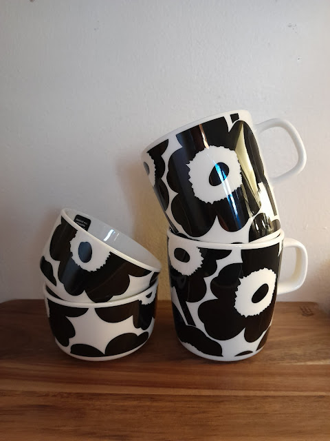 En olekaan pitkään aikaan pistänyt rahaa sisustamiseen, mutta innostuin nyt kun sain hyvään Ale -hintaan Marimekon Unikko astioita joten päätin sijoittaa 😊. Eli nämä tilasin Nordic Nest -nimisestä verkkokaupasta. Halpojahan nämä eivät vieläkään olleet, mutta jos ostaa harvoin jotain niin silloinhan voi sijoittaa vähän enemmän, eikö? 😁 Ja tämä musta kuosinen Unikko on niin klassikko, että ajattelin näiden samalla toimivan keittiön koriste-esineinä. Joka aamuisella kahvillahan en näitä käytä, mutta toisinaan ja esimerkiksi some -kuvissa. Nuo mukit ovat isompaa kokoa, ei sitä normaalia ja maksoivat nyt 16€ / kpl. Eli reilusti yli kaksikymppiä on normaali hinta. Murokulhot olivat 12€ / kpl.. normaalia hintaa en muista.